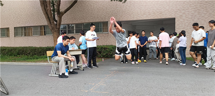 测试现场秩序井然,活力涌动。身高体重测量处,学子们自觉排队,工作人员细致核对、精准记录;肺活量测试区,大家屏气凝神深吸一口气,奋力吹气时,仪器屏幕上跳动的数字见证着体能储备;立定跳远场地,从屈膝预摆到纵身一跃,连贯的动作引来阵阵喝彩,围观同学的加油声此起彼伏。