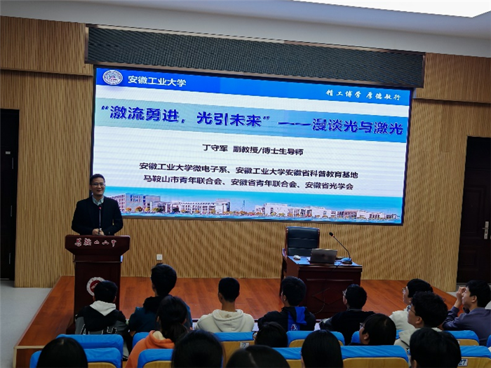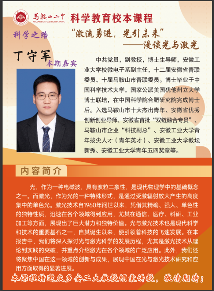 继“科学教育进校园”系列课程首讲收获热烈反响后,马鞍山二中于近期再度为学子们搭建起接触前沿科技的桥梁。本次活动特邀安徽工业大学校微电子系副主任丁守军副教授主讲,以“激流勇进,光引未来”——漫谈光与激光为主题,带领同学们走进光与激光的奇妙世界,开启一场兼具科学性与趣味性的探索之旅。