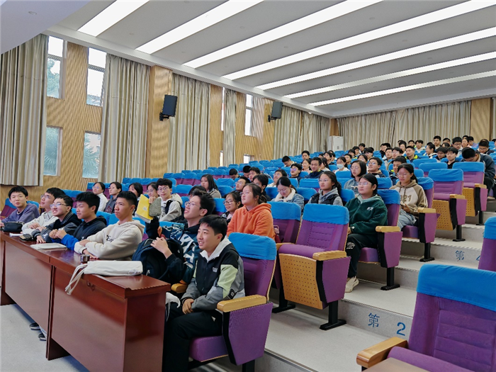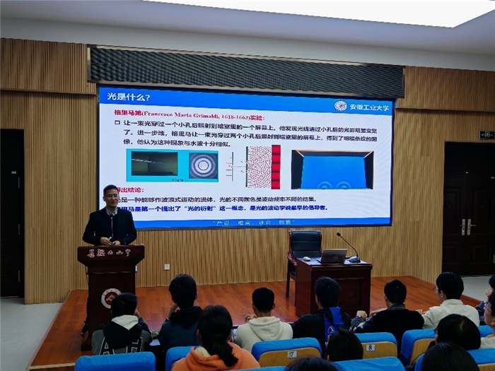 讲座伊始,丁守军副教授从生活中的光现象切入,用“阳光照亮教室”“彩虹的形成”等同学们熟悉的场景,自然引出“光的波粒二象性”这一核心概念。他没有采用晦涩的公式推导,而是通过生动的比喻,比如将“横波”比作蛇的前行,“纵波”比作蚯蚓如东,让抽象的物理知识变得通俗易懂,瞬间勾起全场同学的好奇心。
