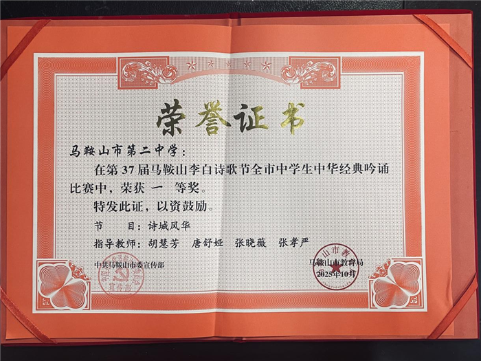 在第37届马鞍山李白诗歌节全市中学生中华经典吟诵比赛中,我校原创作品《诗城风华》,以灵动的演绎、深厚的底蕴脱颖而出,在全市中学生中华经典吟诵比赛中荣获一等奖,同学们用青春之声诠释了诗城文脉的绵延力量。