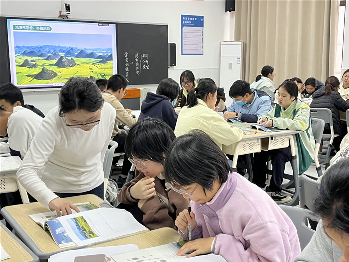聂梦醒老师执教的是必修第一册教材中的《常见地貌类型》,将化学实验引入课堂,通过石灰岩溶蚀的化学反应式,具象化喀斯特地貌的形成机理,打通地理与化学的知识关联;同时,借“桂林山水”诗词、人民币图案等文化元素,融入语文审美感知,让地貌认知兼具科学逻辑与人文温度,既降低了地貌成因的理解难度,也拓展了地理学习的学科边界,让综合素养培养更具层次感。
