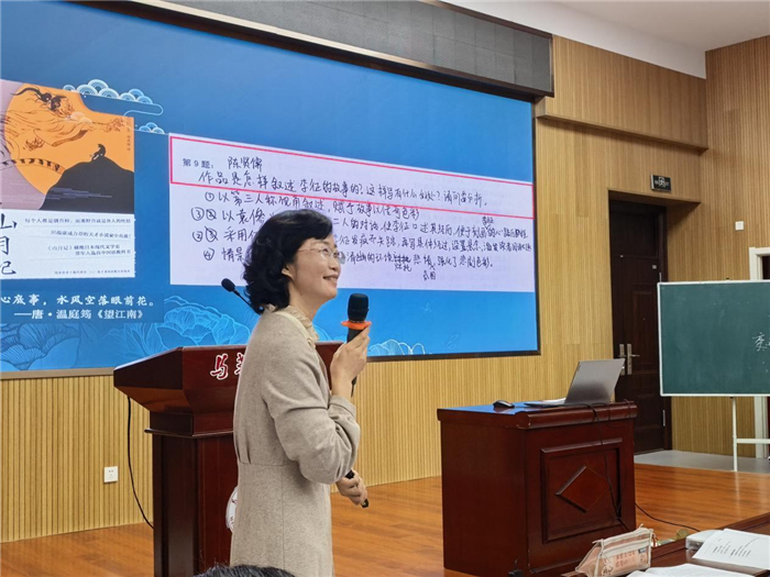 魏志军老师则以“从小说命题说开去”为题,展示了一堂富有创见的语文专题课。魏老师从小说命题设计出发与学生一同探究小说的出题方式。她巧妙结合经典小说《变形记》与《山月记》,带领学生“出题、析题、写题”,激发学生从文本解读走向思想探索,使学生深刻理解“因文设题,读写结合”,培养了学生的深度思维与文学鉴赏能力。课堂互动积极,思维活跃,展现了对语文教学内涵的深度挖掘。