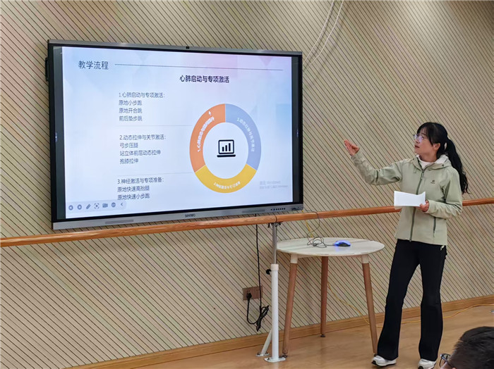 程瑾老师的课堂展现了极强的应变智慧与教学设计功底。受天气等客观因素影响,她灵活调整授课形式,将原定的室外田径课转为室内说课展示。课堂上,她以清晰的教学思路梳理田径项目核心知识点,通过详实的环节拆解、直观的动作示范图示,将起跑、加速、冲刺等技术要点层层剖析,既保留了田径教学的专业性与系统性,又通过互动问答、小组讨论等形式调动学生参与热情,让抽象的技术原理变得通俗易懂,充分彰显了“以生为本”的教学理念与灵活应变的课堂驾驭能力。
