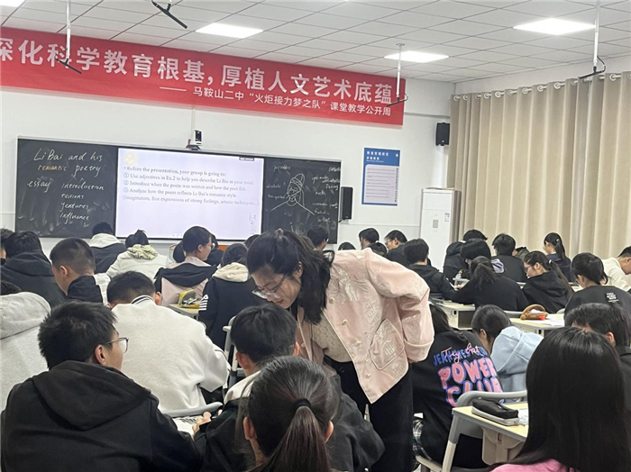 计珂老师的“Li Bai and his romantic poetry”拓展阅读课,立足高一国际班学生的诗词积累,以李白浪漫主义诗歌为载体,通过海报创作、诗歌推荐等任务,让学生在英语语言环境中深入理解传统文化。同时,计老师还将课前布置的资料搜集任务与课堂展示相结合,充分调动了学生的参与热情。