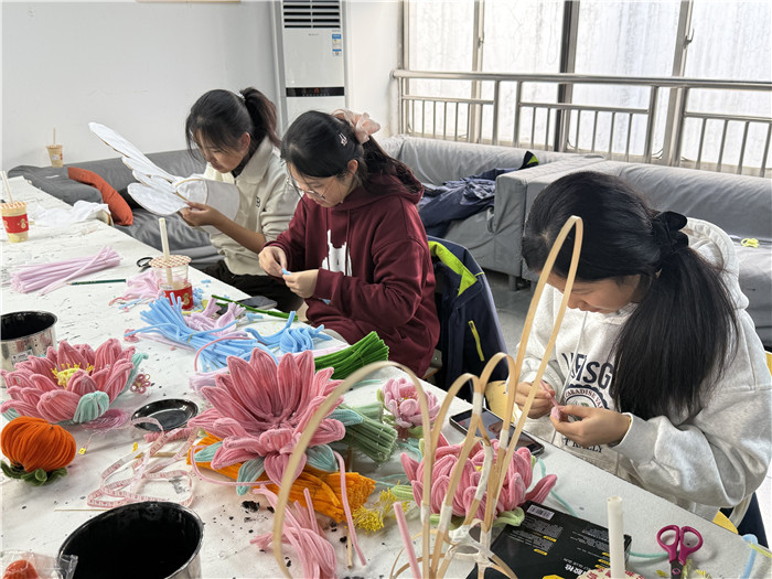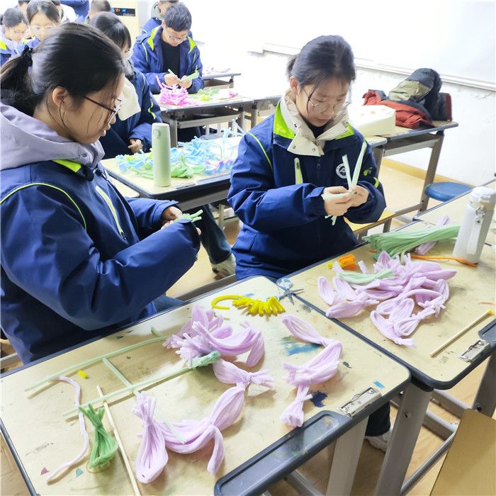 (学生在课堂上制作花灯)