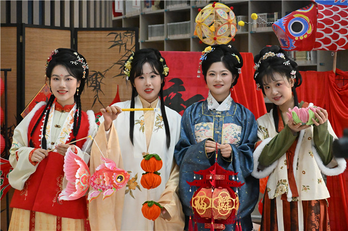 (活动现场同学们身着汉服感受新春氛围)