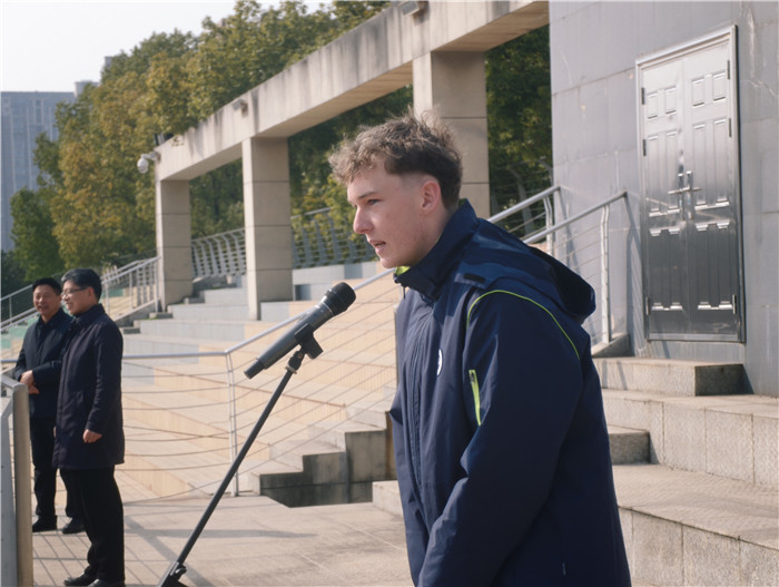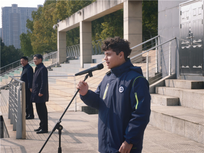 上午9时40分,学校开学典礼在体育场隆重举行。庄严的升旗仪式后,王玉平校长为Thomas、Martin两位国际学生郑重颁发校徽。一枚校徽,是学校的正式认可,更象征着他们正式成为我校大家庭的一员,与全校师生携手同行、共赴新程。两位国际学生面向全校师生作自我介绍,现场掌声不断、气氛热烈。