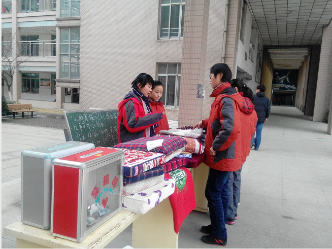 2015年1月15日周四中午,我们在校教学楼前的过道上进行了进行了一次义卖活动,义卖的物品全部是高二同学们亲手制作的坐垫。