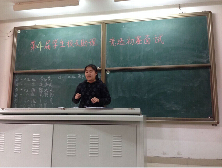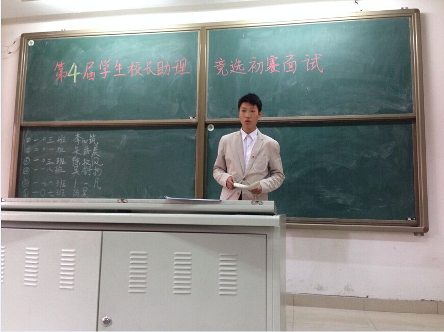 10月24日,一连数日秋雨缠绵洗出难得的天高云淡。风轻日暖,晴空长雁,中午12时40分,2014届学生校长助理竞选的面试部分正式于南教学楼一楼阶梯教室拉开序幕。