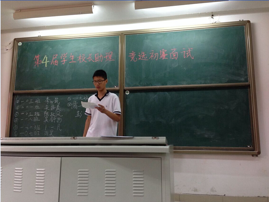 面试于南阶梯教室102进行:抽签决定顺序后,在一定时间内只允许一人入内参试,其余竞选者则于101备考候选。座下评委为六人阵容:其中,三位来自学生会主席团,两位学生会部长,一位团委老师。面试时,先由竞选者进行两至三分钟的自由演讲,再由评委针对校园内日常事务与教学管理工作提出相关问题;竞选者简单作答后,当场誊出分数。在竞选当日的候场区,我们可以看见十数位高一高二竞选者认真准备的情形,群英荟萃于一堂:独自埋首修改文稿词句者有之,立于讲台演练实战者有之,来回踱步调整语气者有之,从容自若地谈笑风生者有之……在他们之中,将会有两人经过层层选拔考试脱颖而出,组建成新一届学生校长助理团。让我们拭目以待,相信未来,相信不久将会走出大有所为的二中风采。