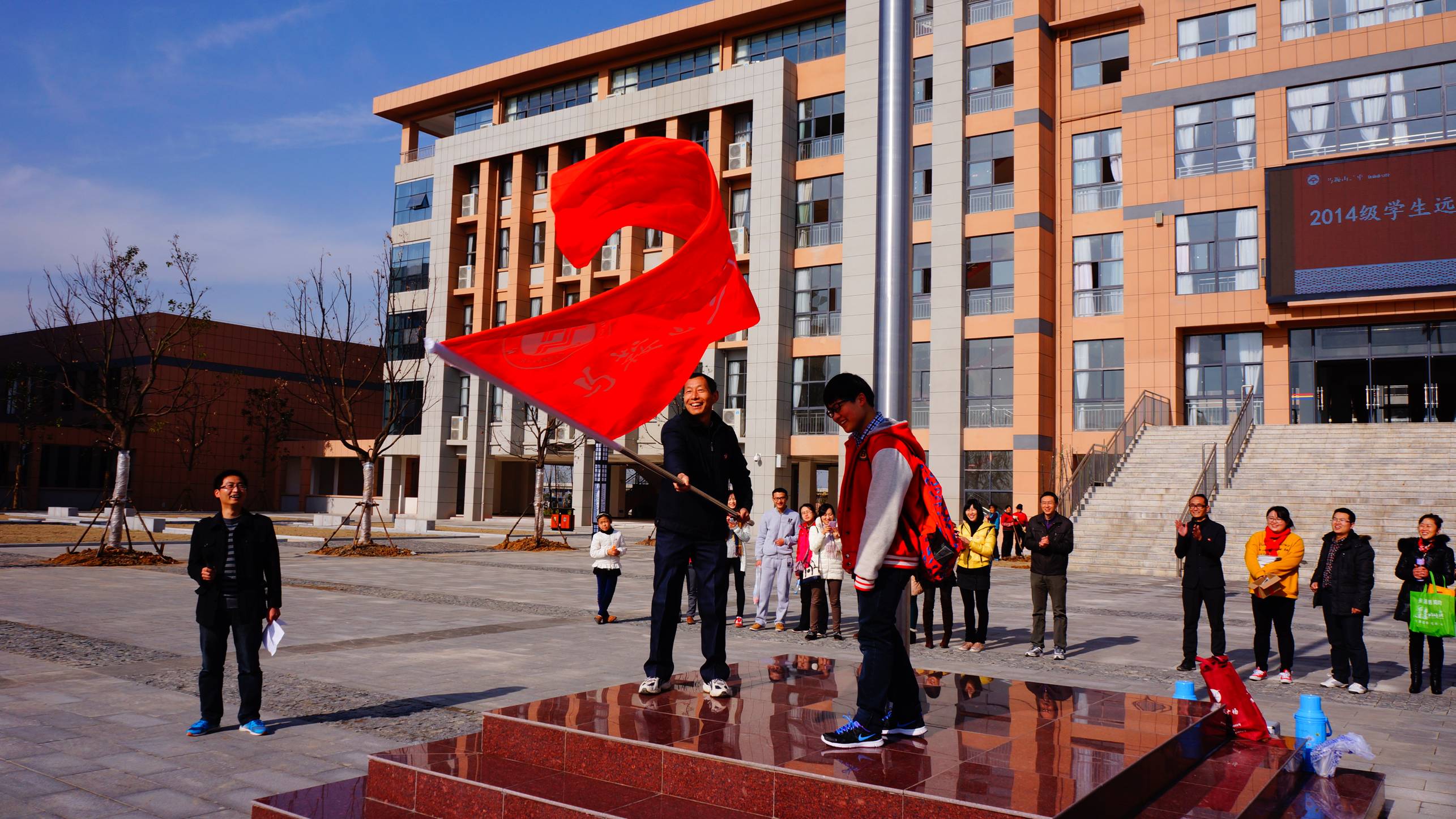 活动伊始,全体师生在校中心广场举行了简单而隆重的授旗仪式。学生事务中心金加林老师首先宣读了远足活动安排和注意事项,随后由课程与教学中心马富荣老师将远足的旗帜授予马鞍山市中小学生运动会女子铅球项目全市第六名获得者、郑蒲港分校历史上第一位在全市运动会上获奖的选手、109班朱彤同学。