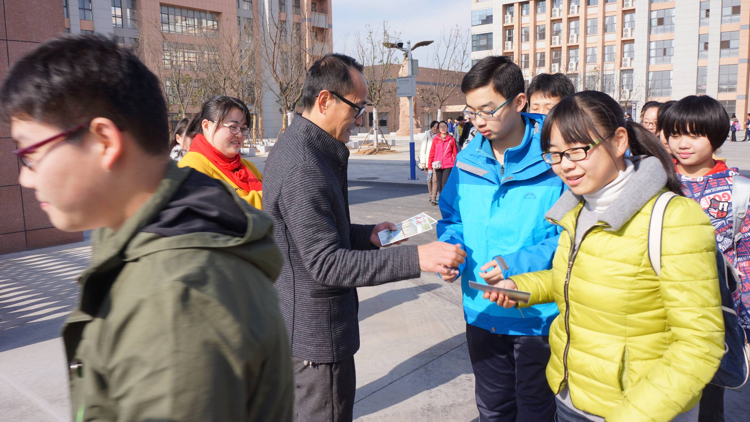 朱彤同学挥舞着手中的旗帜,关闭的校门正缓缓打开,亲切的庆晓校长站在了门口,微笑着向每一位同学发放一张远足纪念卡,卡的正面是马鞍山市长江大桥的美丽倩影,背面是学生事务中心精心准备的本次远足的五个目标点,同学们要根据卡背面的指示,沿途找到图中的五个目标点,然后找负责的老师盖上纪念印章,只有集满所有的印章才算是完成了整个旅途!