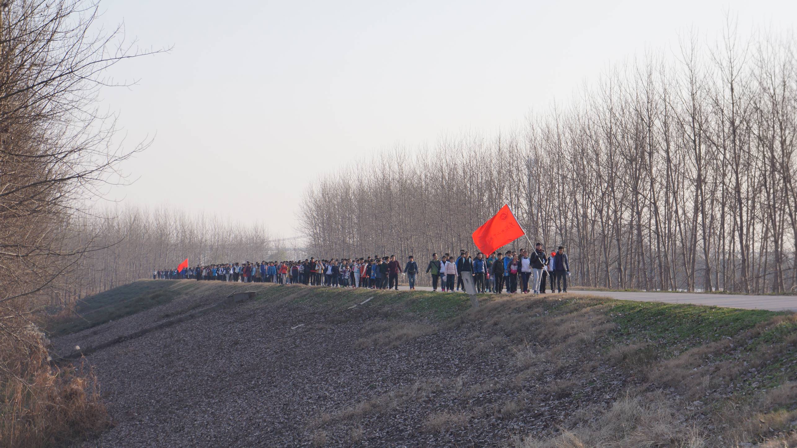 同学们激动地从庆校长手中接过纪念卡,一条蜿蜒的长龙沿着文昌路向前出发了。远足队伍依次经过了正在建设的郑蒲港新区。美丽的白杨路林,风景秀丽的和县大堤,风中柔弱的芦苇荡,青碧翠绿的生态湿地,雄伟壮观的郑蒲港港口……刚开始,同学们都兴奋不已,快步向前,并且叽叽喳喳的聊天,感受着情暖冬日里灿烂的阳光,感受着自然气息。旅途过半后,部分同学开始渐渐感觉到了丝丝疲劳,男生默默的背过女生的背包,同学之间互相鼓励,互相打气,很快这股坚强的意志就感染了所有的同学,大家行走在两岸风景如画的长江大堤的堤岸上,向着憧憬很久的郑蒲港进发。