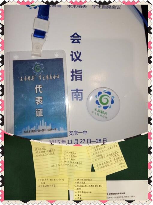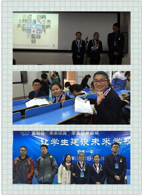 1127-28日,我校学生代表团赴安庆参加了安徽省未来精英学生圆桌会议。我校派出的学生代表为学生会主席高二(3)班张弛同学、学生会副主席高二(10)班赵钰颖同学、学生会副主席高二(3)班杜甜同学,郑蒲港分校学生会主席赵宇灏同学、体育部副部长詹宇昊同学一同参加。本次圆桌会议的主题为:让学生建设未来学校,本次会议分为成果分享会和分组讨论会两个阶段。