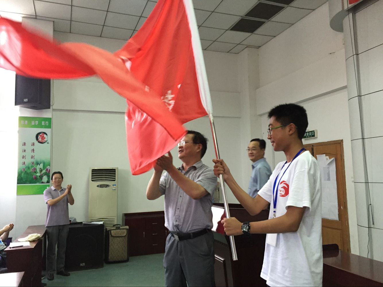 7月31日下午,开营仪式在二中本部二楼报告厅举行。教导处喻全贵主任主持仪式,雏鹰书院院长唐荣宏老师、郭惠宇校长、2016年中考市状元黄至晗同学先后发言。2016年当涂县中考状元潘成龙同学代表全体营员接受郭惠宇校长授予的营旗。