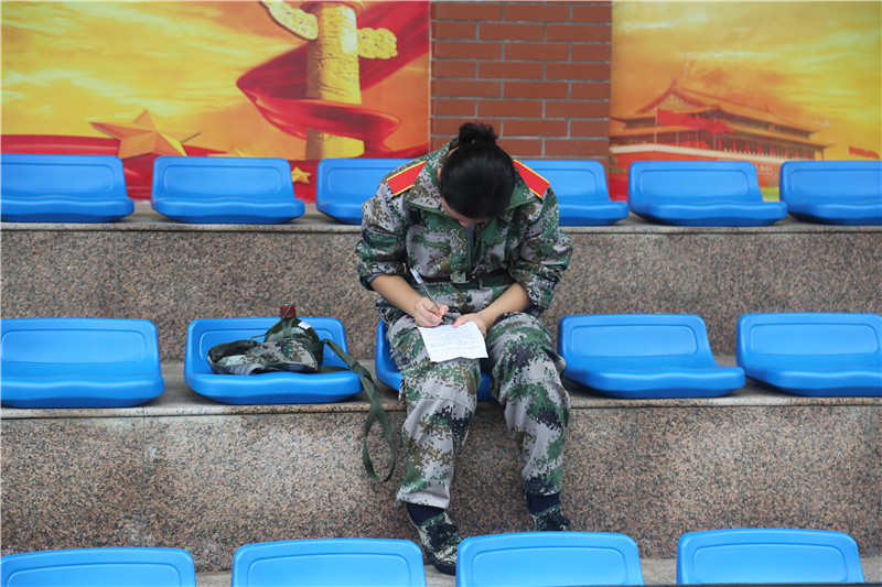 我满心惆怅地回到了寝室,去收拾行李,正在忙的不可开交之际,一声铃声如催命班响起,伴着一声声夏蝉的鸣叫,我们站在太阳下听着教官训话。教官教我们坐地。穿着厚重的迷彩裤一遍遍地练习坐下、站立。有时,一不小心碰到了前面的人,原本瑜伽动作似的坐姿就变成了狗啃泥。