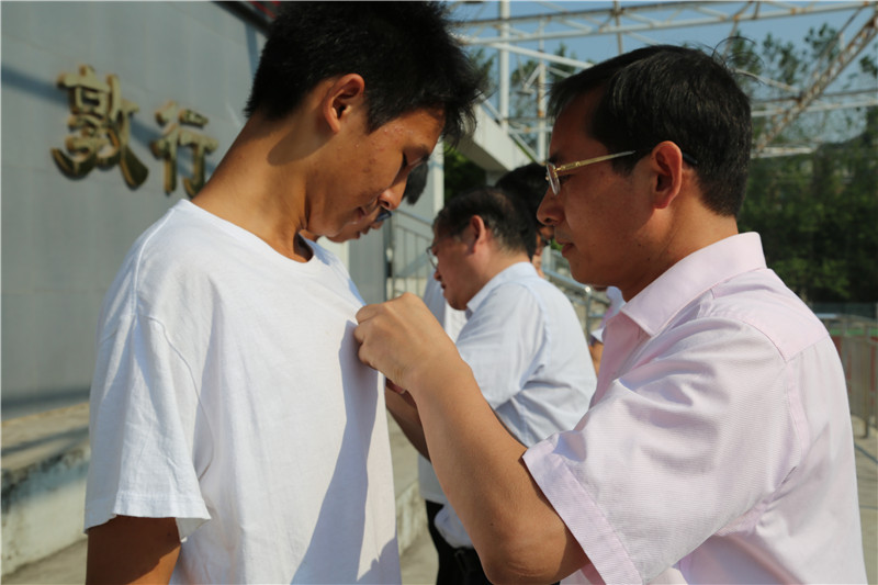 校领导给高一新生代表佩戴校徽,祝贺他们如愿以偿来到二中求学,也勉励他们志存高远,将来为母校争光。