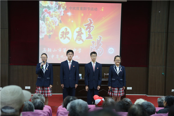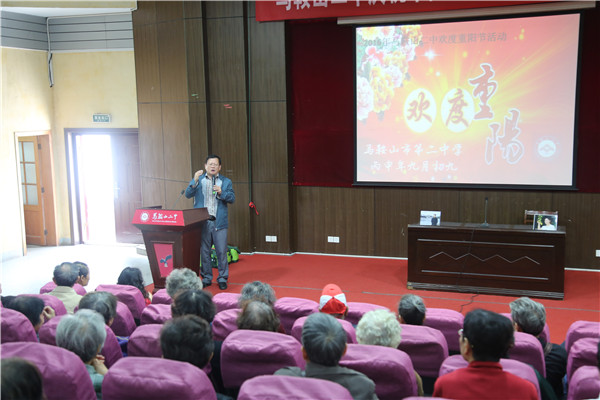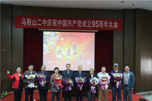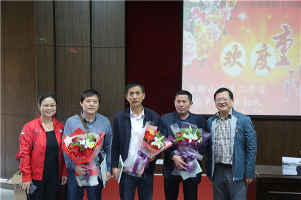 10月9日上午10:00,离退休教工们在校图书馆报告厅欢聚一堂,共度重阳节。原二中工会主席赵朝平同志主持会议。在庆祝活动中,学校领导为今年光荣退休的葛天龙、姜康、袁德明等老师送上了退休纪念照和鲜花,并为90岁寿星李崇恕,80岁寿星伍光彩、刘道明、赵富生,70岁寿星蒙维启、方刚达、梁发志、胡旺玲、张金山等九位老教师们祝寿。寿星代表蒙维启老师以“盼”为关键词作了让人感触良多的发言。校团委组织青年学生为老同志们表演了诗歌朗诵,为他们送上了真挚的感谢和节日的祝福。