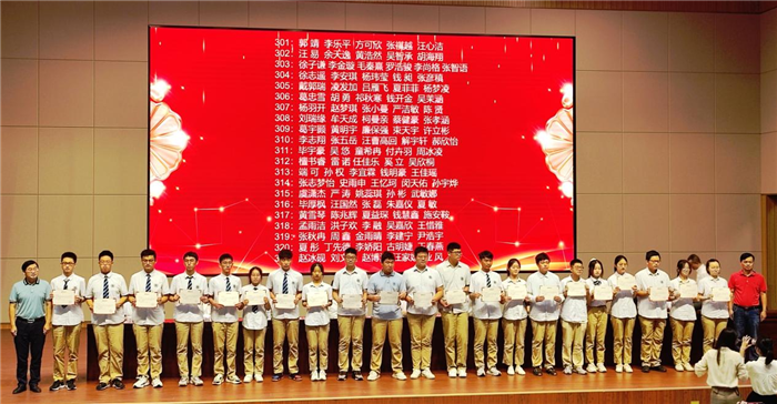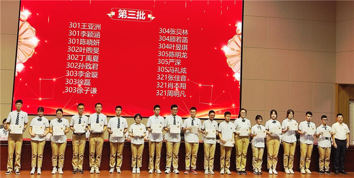 大会在雄壮的国歌声中拉开序幕。教导处主任叶张平宣读了在省六校联考中荣获“学业进步奖”“单科优秀奖”“学业优秀奖”的同学名单。获奖同学依次上台接受校领导为他们颁奖。